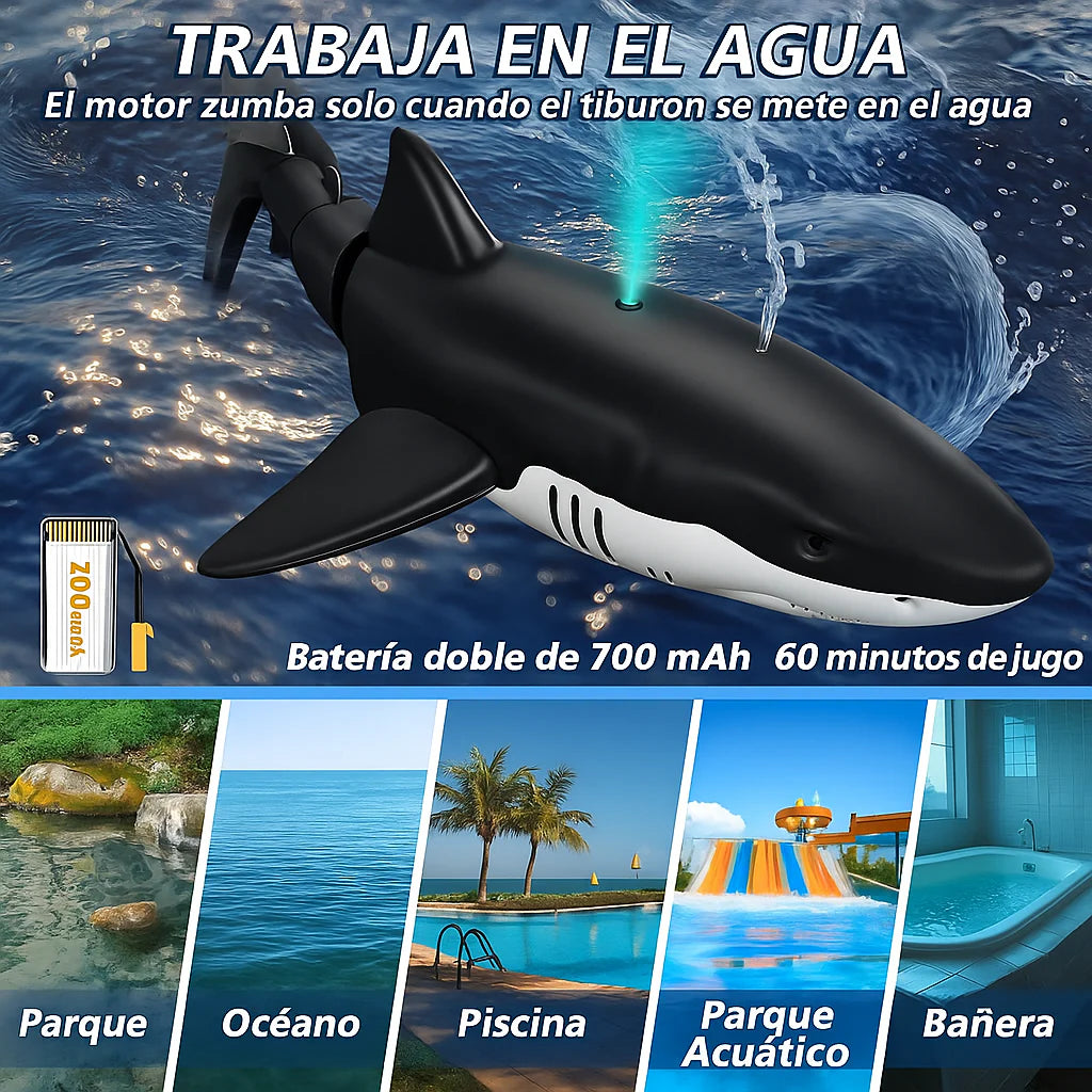 Porque no es un bote cualquiera: es un tiburón RC diseñado para nadar con movimientos realistas de cola, control total gracias a su mando de 2.4 GHz y 4 canales, y batería recargable que brinda diversión por hasta 20 min seguidos . Sumérgelo y prepárate para un espectáculo acuático que sorprende a niños y adultos.