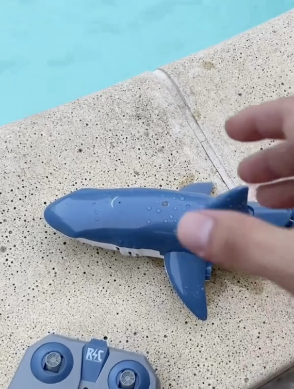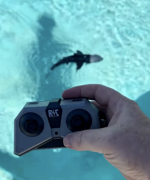 - Carga la batería del tiburón (USB) y coloca 2 pilas AAA en el control